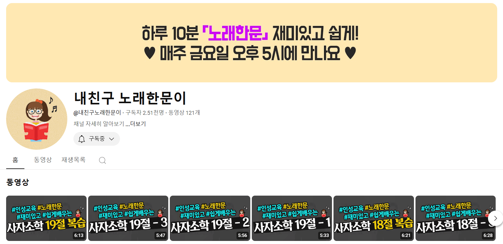 추천 유튜브 : 내친구 노래 한문이