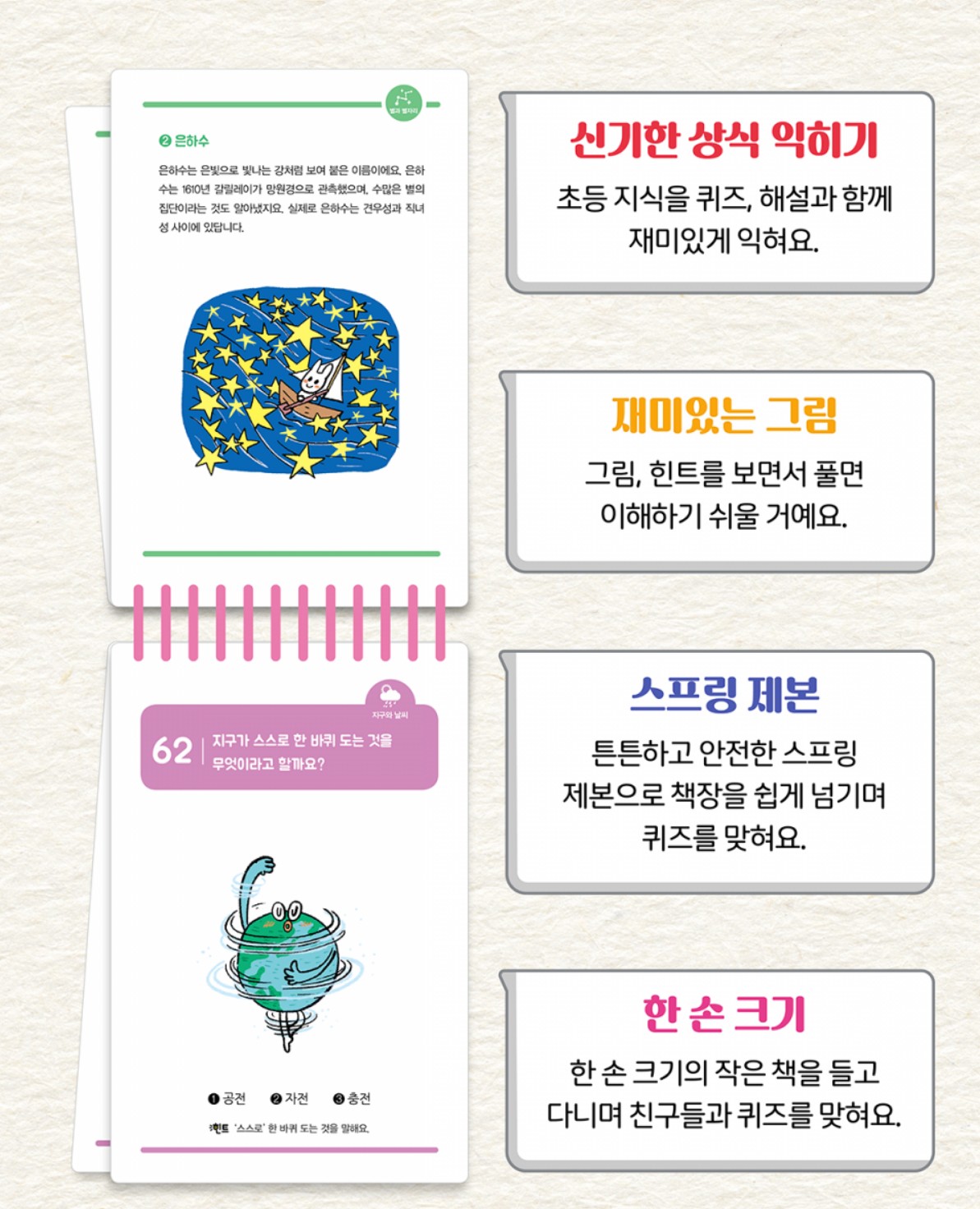 처음 구매를 하실 때에는 아이가 관심 가질만한 재밌는 분야로 골라서 주는 것이 좋습니다. 부모와 또는 친구, 형제들과 퀴즈를 내고 맞히는 과정에서 재미와 오랫동안 기억에 남을 수 있는 시간이 됩니다.