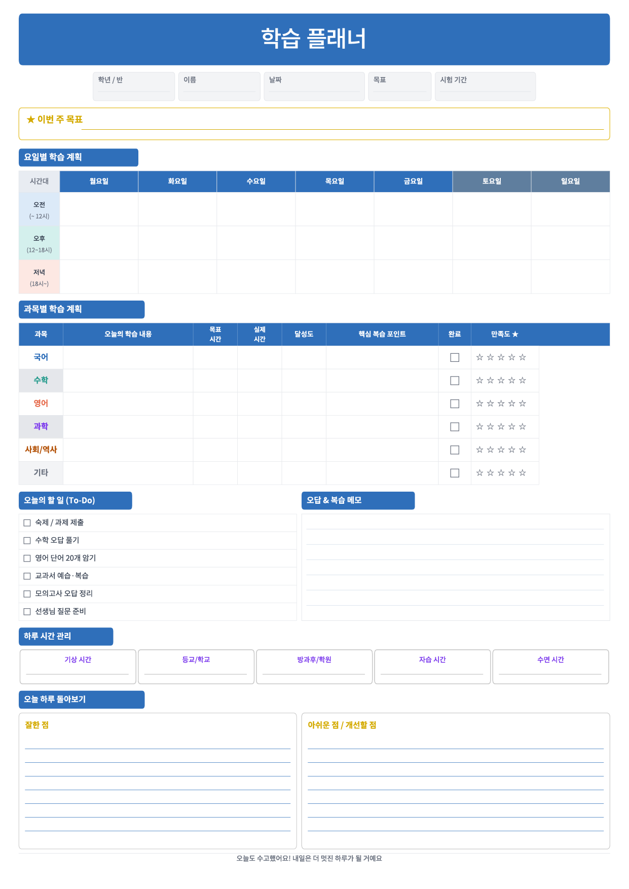 | 저녁 | 복습 30분 | 오답 정리 | 수학 | 국어 | 영어 | 오답 점검 | 계획 수립 |