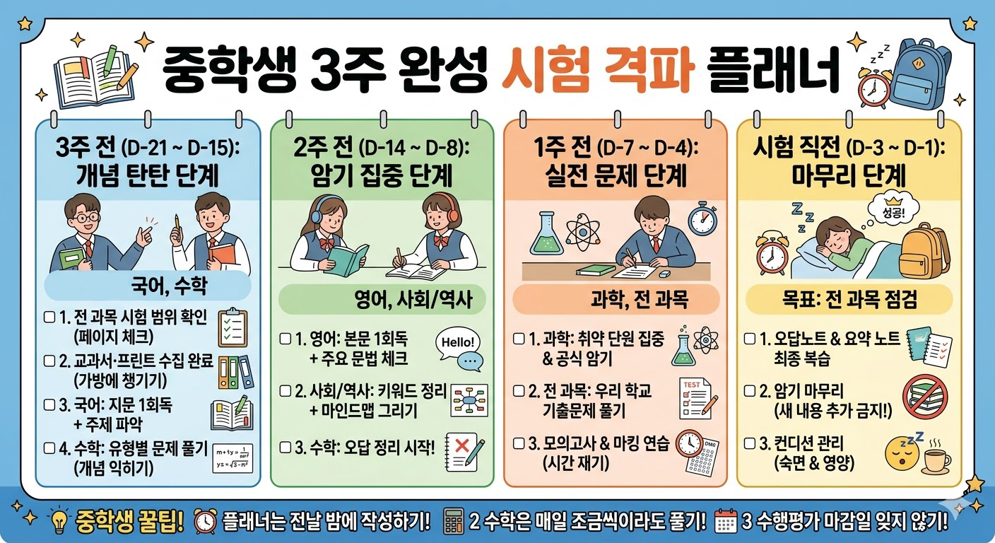 시험 3주 전, 교과서·프린트·수업 노트 범위를 명확히 확인합니다. 범위 없이 공부하면 시간 낭비입니다.