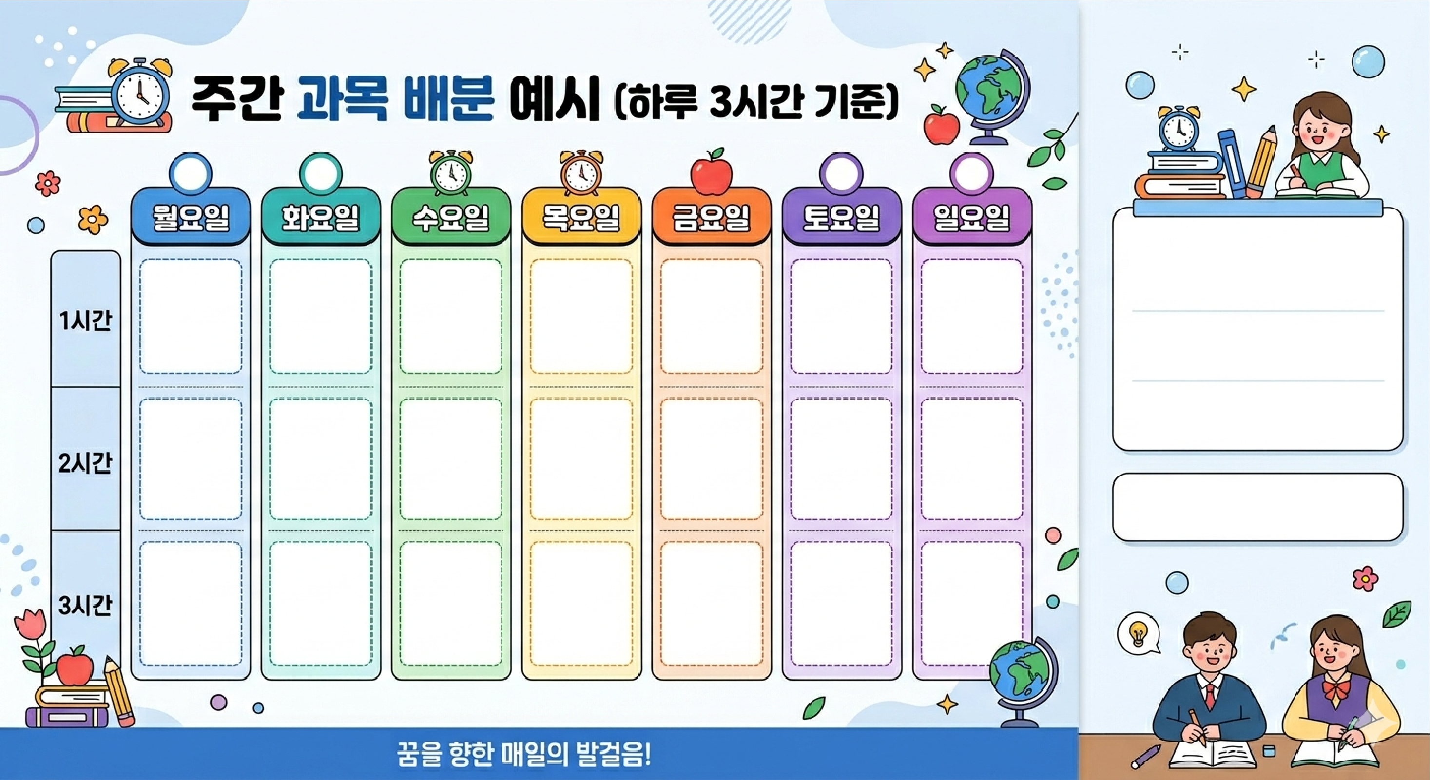 시험 날짜를 확인하고, 위의 플래너 양식을 노트에 옮겨 적어보세요. 계획을 세우는 것만으로도 불안이 절반으로 줄어듭니다.