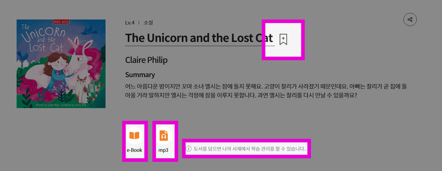 ▶ 도서 담기 아이콘 선택 : 도서를 담으면 나의 서재에서 확인, 이어서 학습 가능