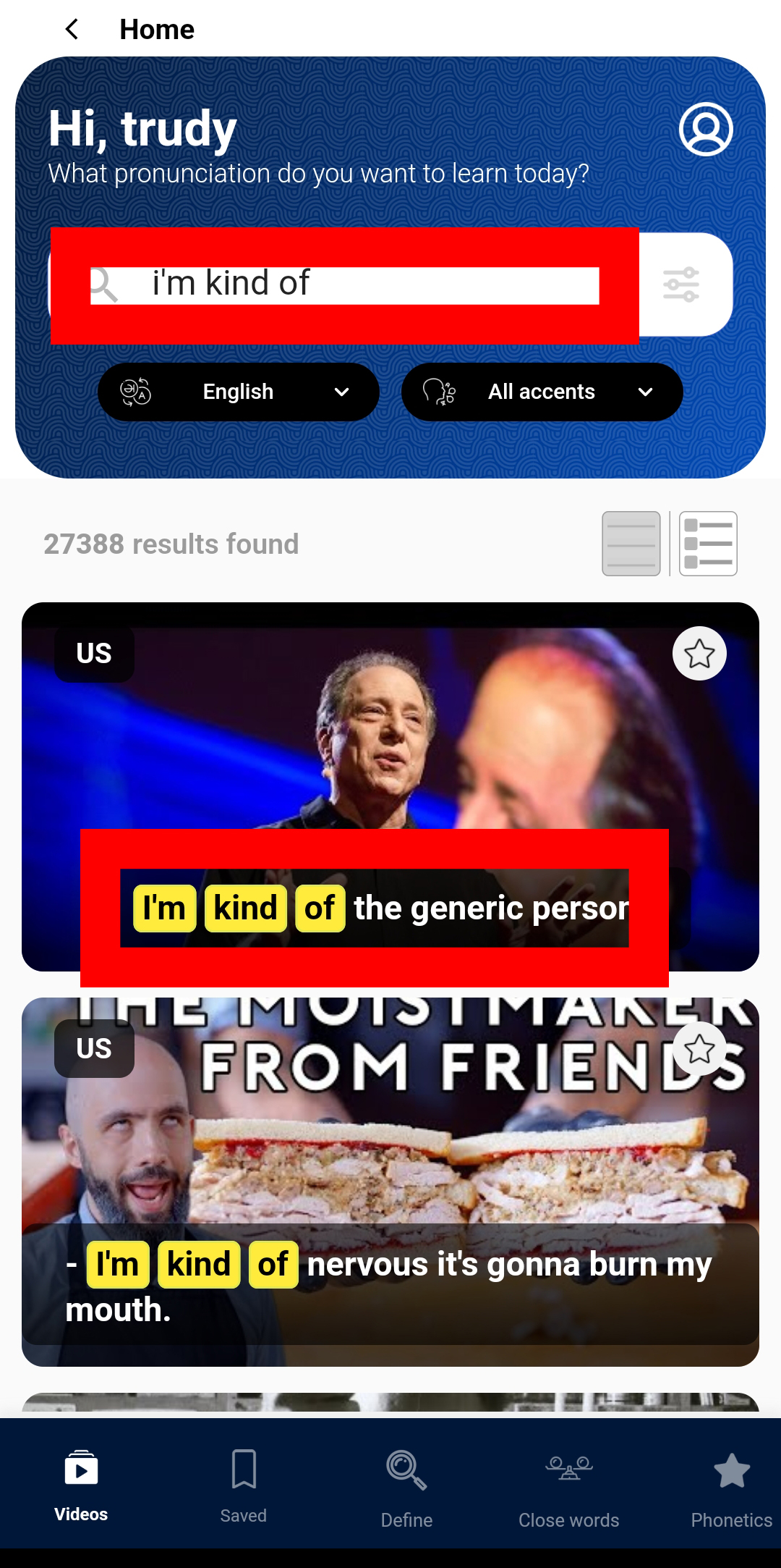 선택한 문장을 유글리쉬 사이트에 입력하고, 검색 결과에서 원하는 억양 및 발음 버전의 동영상 클립들을 는다.